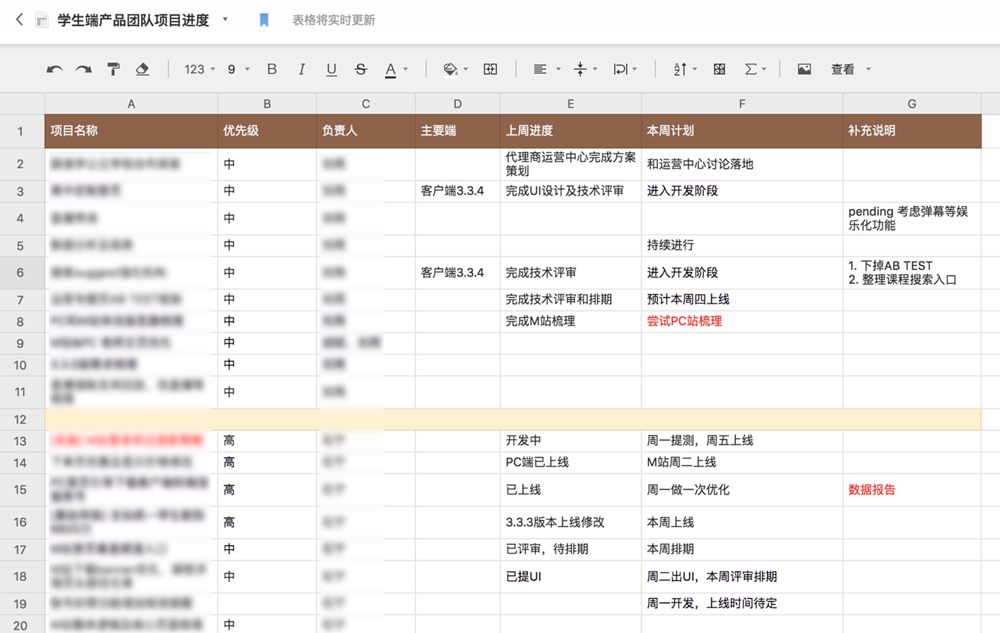 团队成员每周最后一个工作日更新自己的项目进度,包括上周进度、下周计划、是否有异常情况。周末我会 review 一下项目,批注一下项目的重点问题,然后周一例会和大家再沟通一遍,看看大家的具体反馈。
