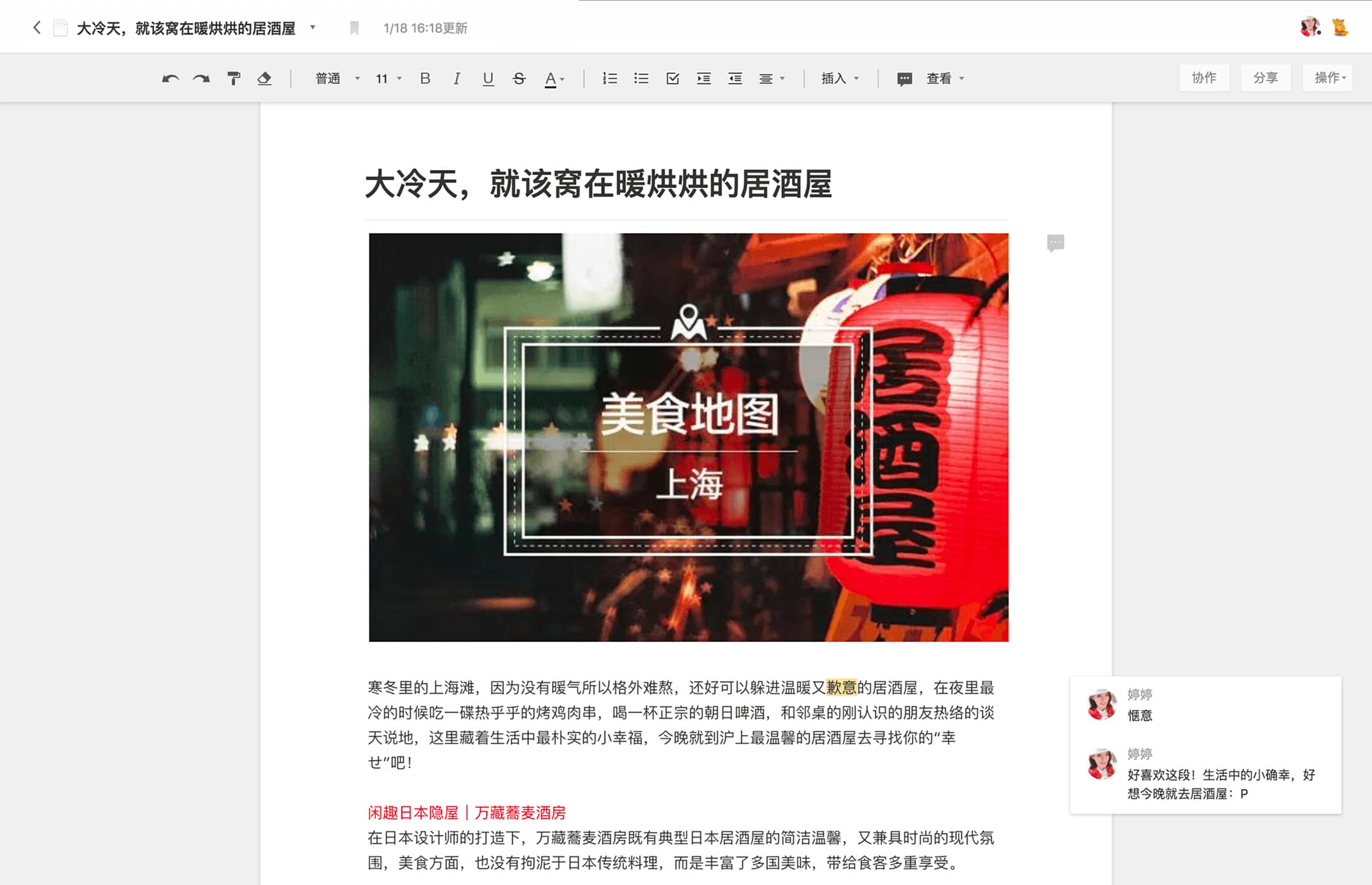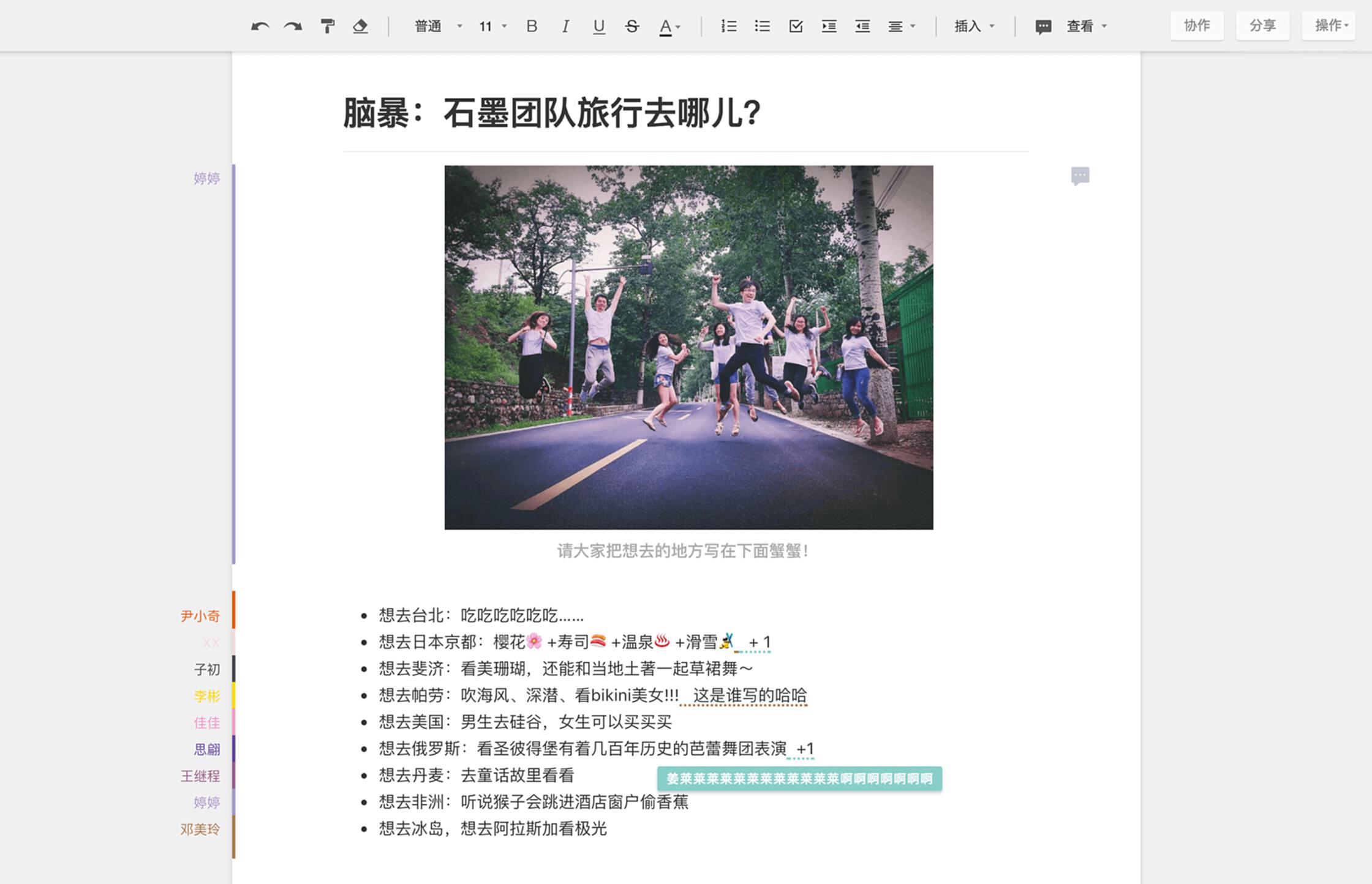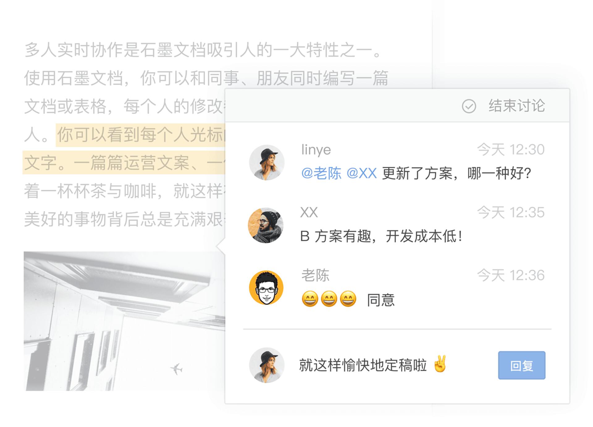 团队合作的目的就是将个人力量变成团体力量,而最基础的一点就是保证团队每个人都发声。打开一份提案,将文档分享给所有团队成员,员工们可以针对自己有兴趣的点发表意见,而当所有人都表达完毕后,方案也就确定下来了。
